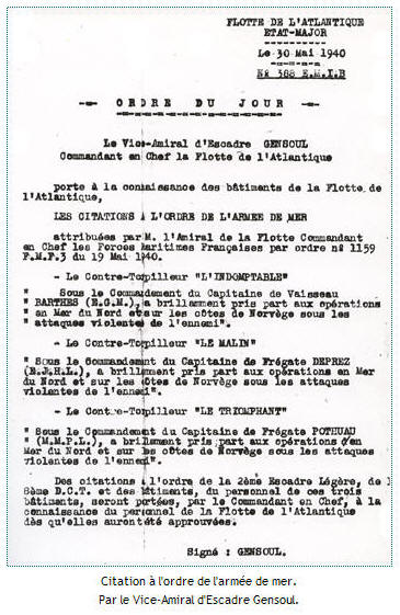 l’Indomptable, sous le commandement du Capitaine de Vaisseau BARTHES