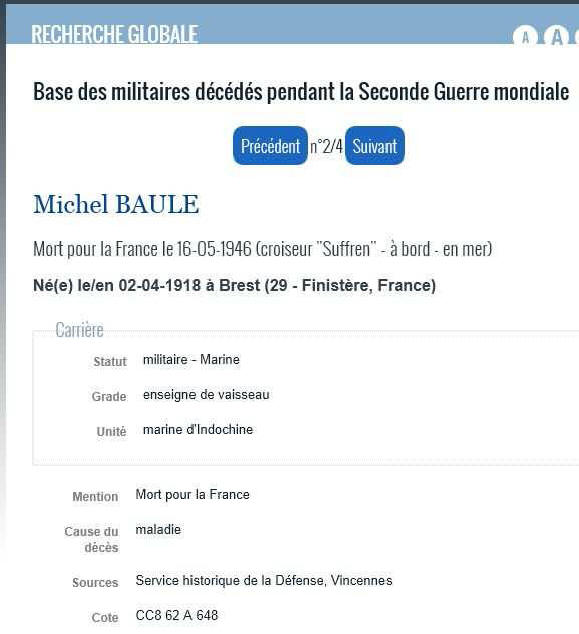 - Décédé le 15 mai 1946 à SAIGON (Cochinchine, Sud Vietnam)