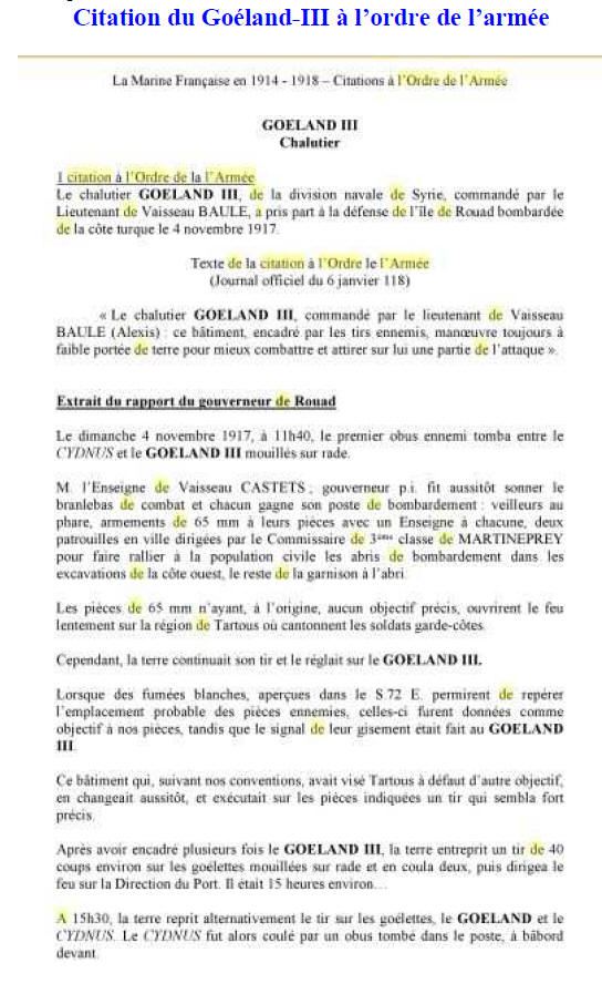 dragueur auxiliaire "GOÉLAND-III", il est cité à l'ordre de l'Armée