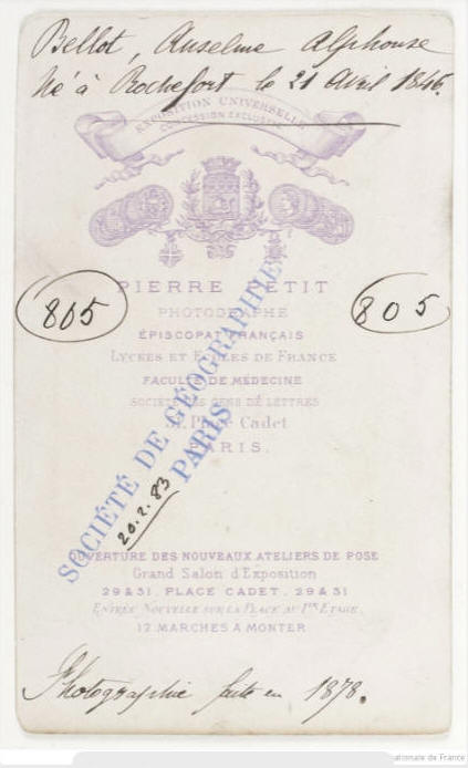 3 mars 1875 : il est admis comme membre à la société de géographie