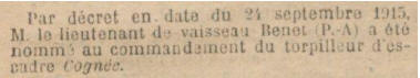 décret de même date (J.O., 26 sept. 1915, p. 6.863), nommé au