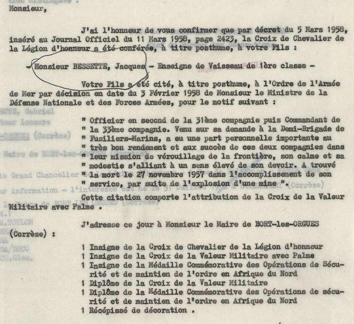 1958 (JO du 11 mars 1958), l'enseigne de vaisseau Bessette a été