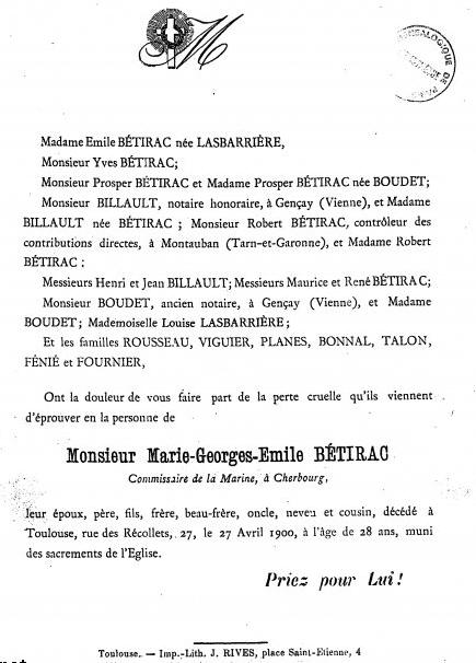 Né le 23 avril 1872 - Décédé le 27 avril 1900 à TOULOUSE (Haute