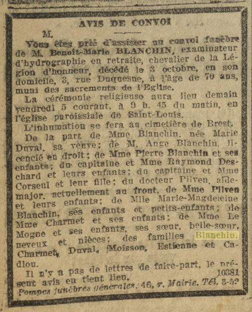 Décédé le 3 octobre 1917 à BREST (Finistère).