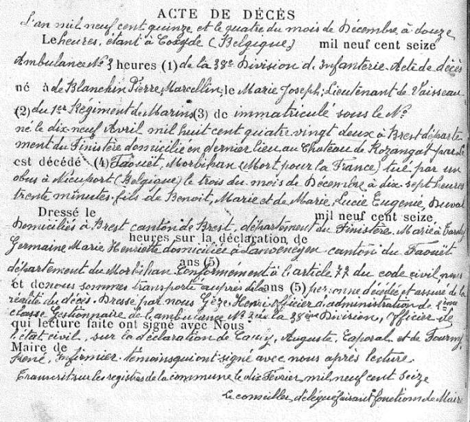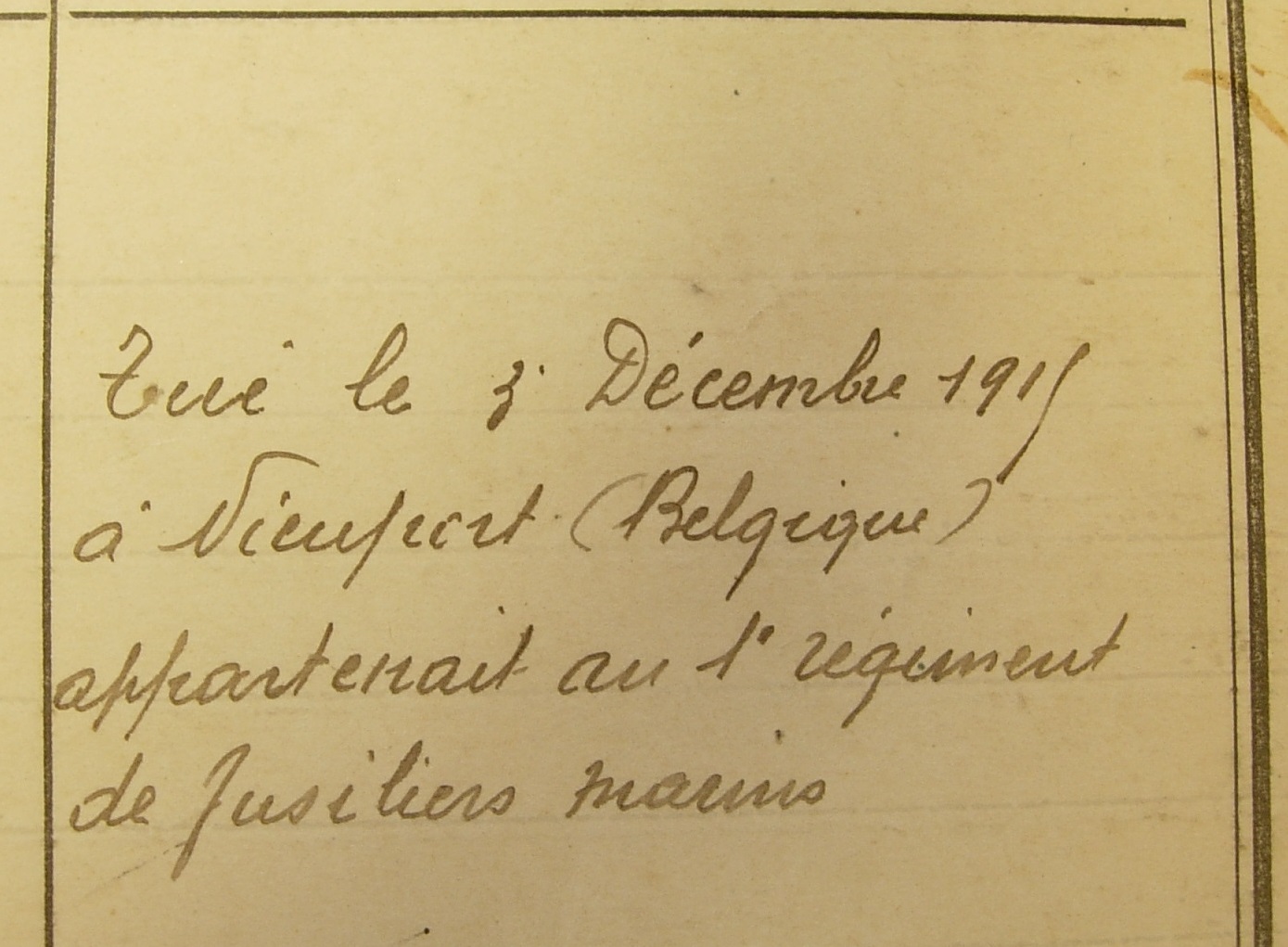 BREST (Finistère) - Tué le 3 décembre 1915 à NIEUPORT (Flandre