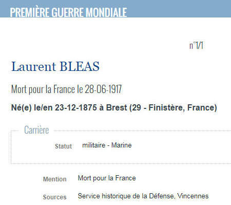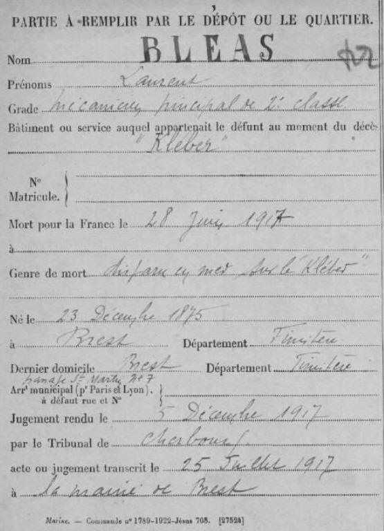 Né le 23 décembre 1875 à BREST (Finistère)- Décédé en mer le 28 juin