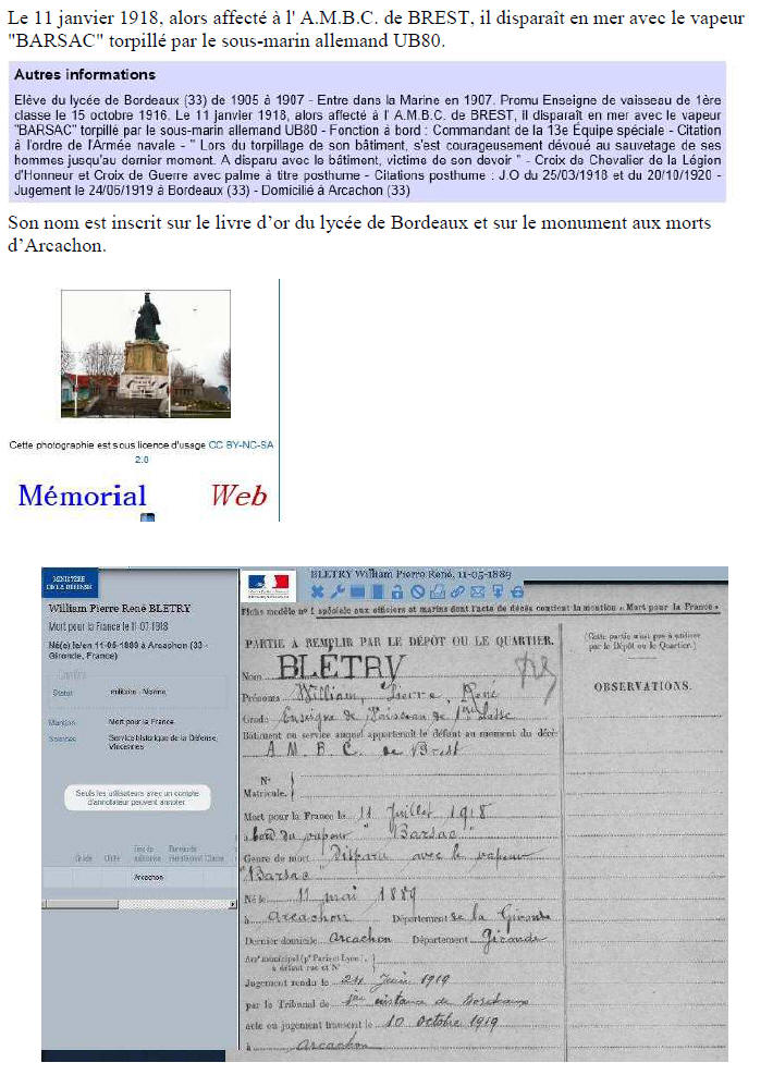 ARCACHON (Gironde) - Décédé le 11 janvier 1918 en mer à 15 milles du