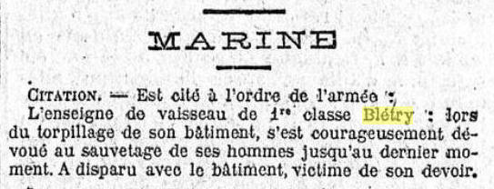 d'Honneur; citation à l'ordre de l'Armée navale.