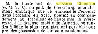 Commandant le torpilleur de haute mer "TÉMÉRAIRE" à BÔNE (Second,
