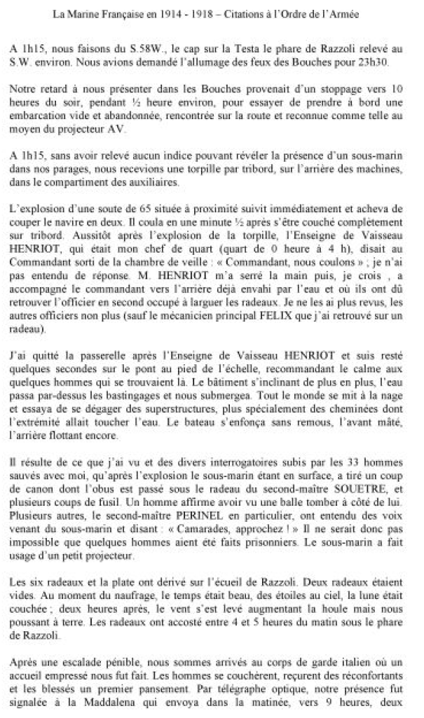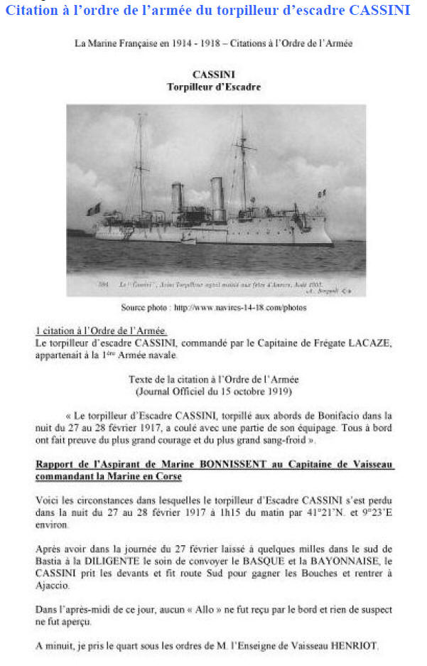 novembre 1916, embarqué sur le torpilleur "CASSINI", il est cité à