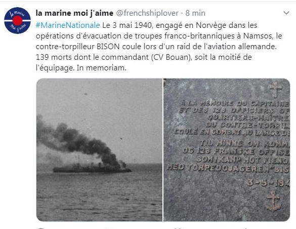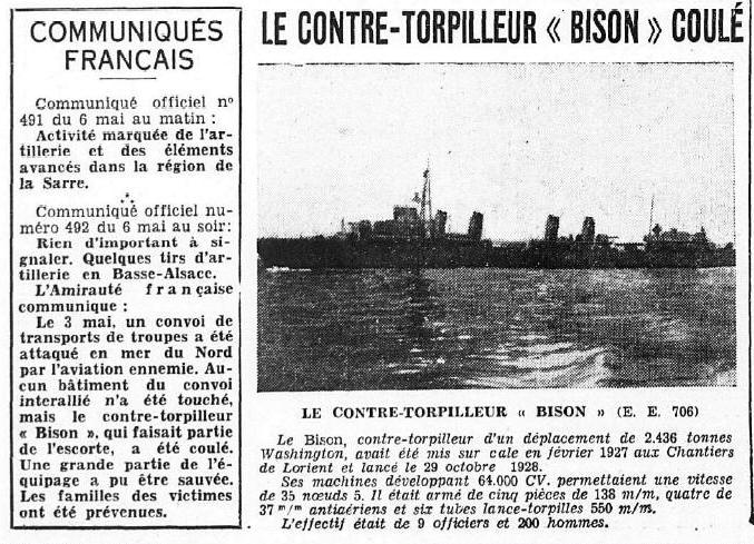 contre-torpilleur Bison coulé le 3 mai 1940.