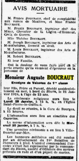 BOURGES (Cher) - Décédé le 21 janvier 1924 à bord du BISSON, en mer