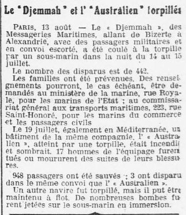 était affecté sur le "CONDORCET", disparaît en mer avec le vapeur "DJEMMAH",