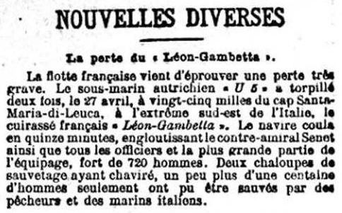 (Cdt Georges ANDRÉ); torpillage par le sous-marin autrichien "U5" le