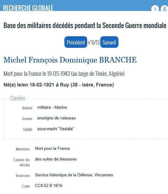 Cab du 1er juillet 1943, l'enseigne de vaisseau Branche a été nommé