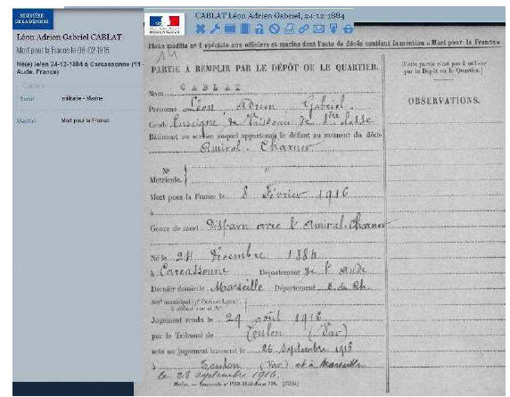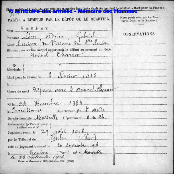 à CARCASSONNE (Aude) - Décédé le 8 février 1916 en mer, à l'Ouest de