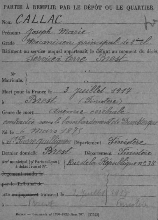 En service à terre à BREST, il décède d'une anémie cérébrale