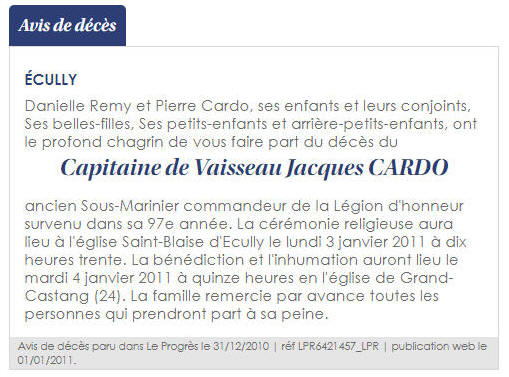 Né le 1er mars 1914 - Décédé le 30 décembre 2010 à ECULLY (Rhône)