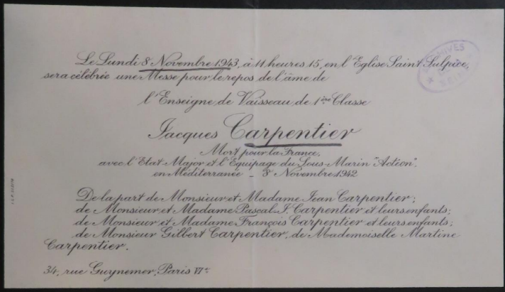 PARIS VIème (Seine) - Disparu en mer le 8 novembre 1942 au large