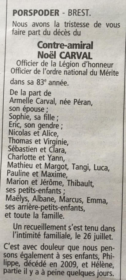 Obsèques le 26 juillet 2018 à PORSPODER (Finistère)