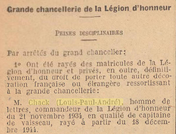 novembre 1934, il retire à la lecture du verdict sa rosette de la