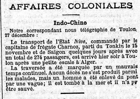 Le 1er septembre 1893, Commandant le transport "NIVE", Service de