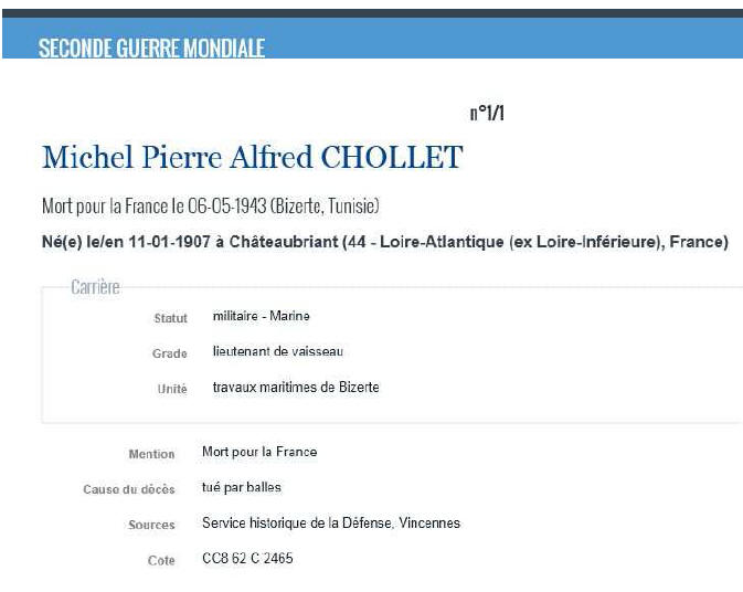 vaisseau Chollet, qui n'avait pas été rapatrié, fut tué à La