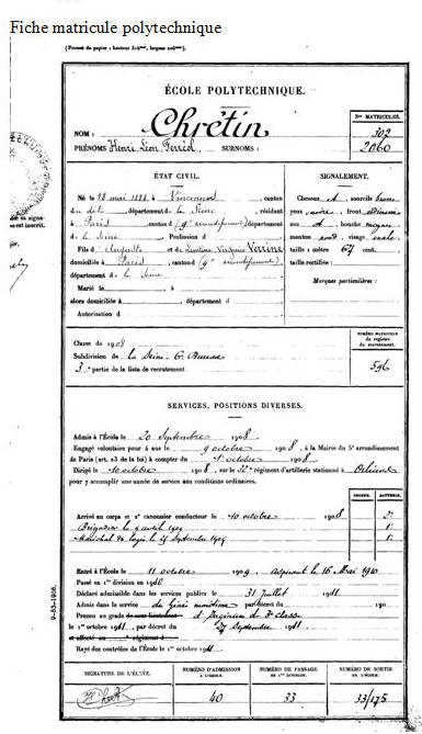 Ingénieur de 3ème classe le 1er octobre 1911, à PARIS, Élève de