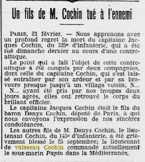 20 juillet 1916, Commandant le sous-marin "PAPIN".