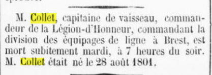 Né le 28 août 1801 à BREST (Finistère) - Dècédé le 20 décembre