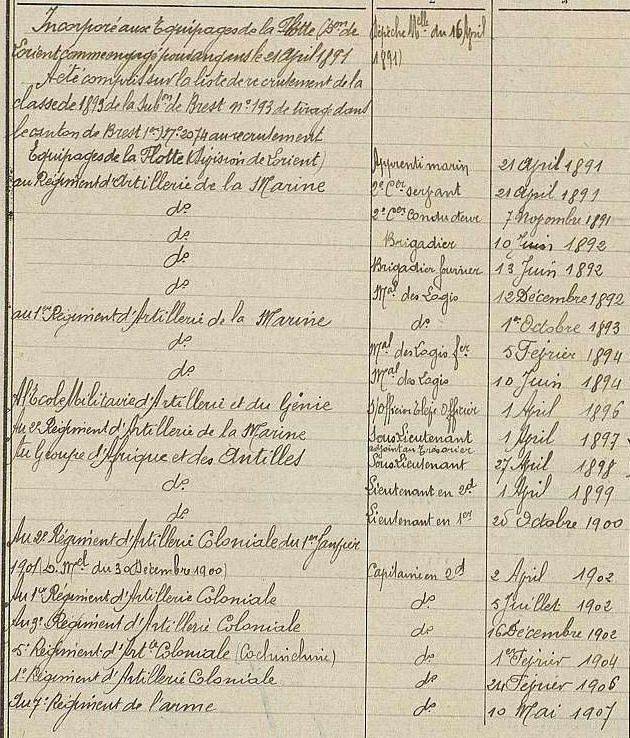 avril 1891, incorporé aux équipages de la Flotte à LORIENT..
