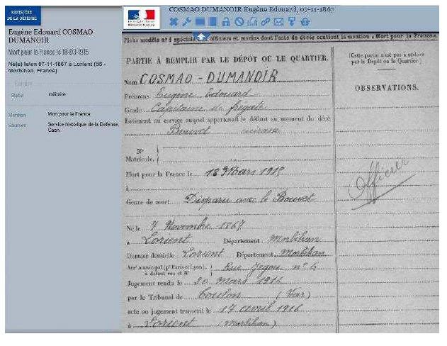 décès rendu le 20 mars 1916 à TOULON, transcrit à LORIENT le 17