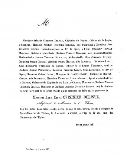 Décédé le 7 octobre 1865 à l'Hôpital maritime de SAINT-MANDRIER