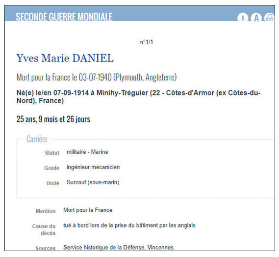 Né le 7 septembre 1914 à MINIHY TREGUIER (Côte d’Armor). Tué, le 3 juillet 1940 à PLYMOUTH (Angleterre).