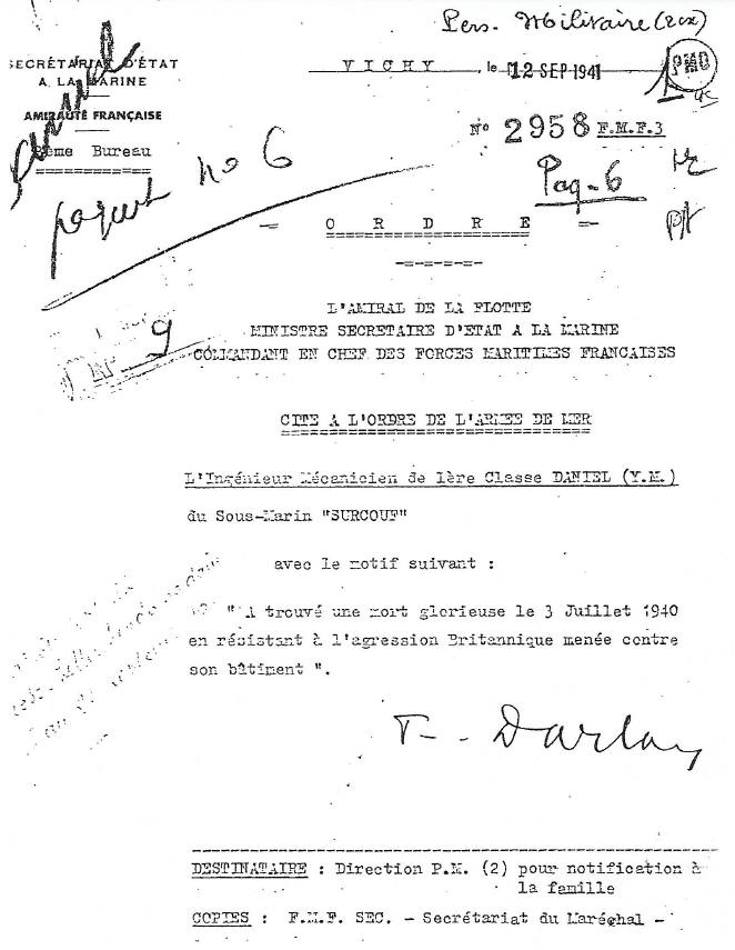 de Mer « a trouvé une mort glorieuse le 3 juillet 1940 en résistant