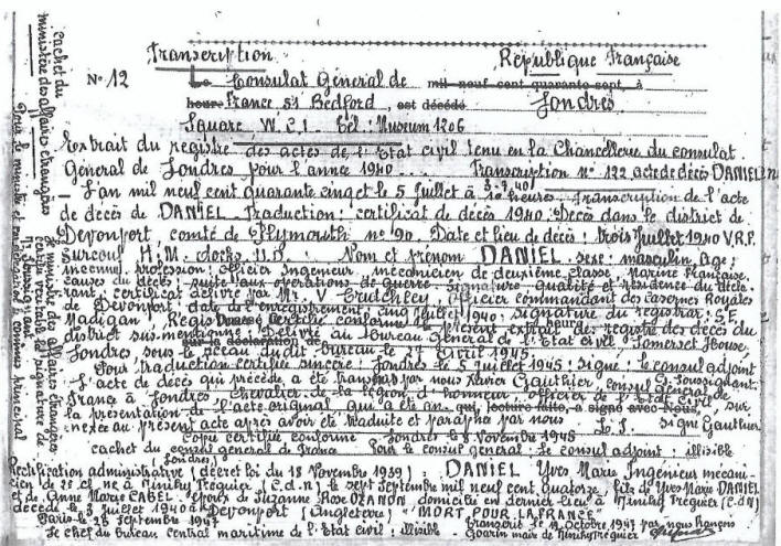 le 5 juillet 1940 en Angleterre ( Plymouth). Le corps y est resté