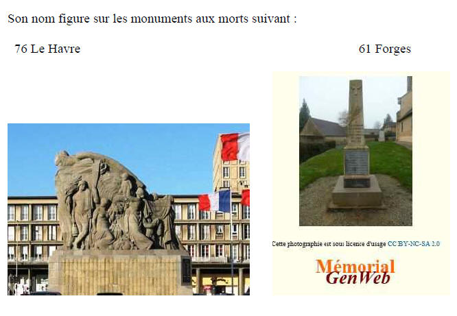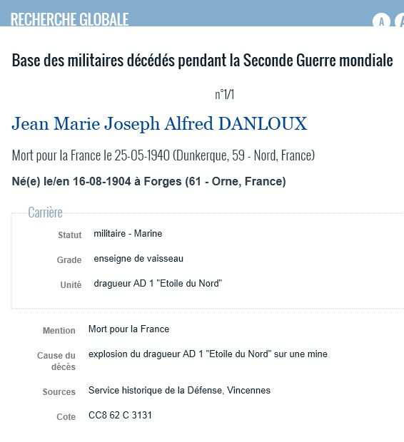 Décédé en mer le 25 mai 1940 à DUNKERQUE (Nord).