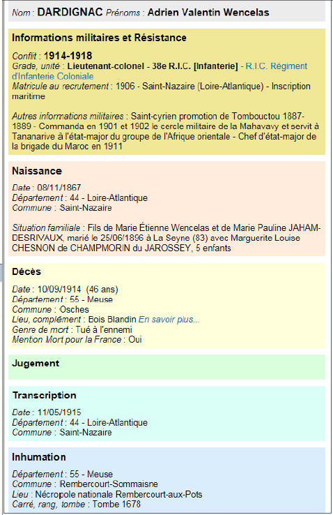 À son décès, Lieutenant-colonel au 38ème R.I.C..