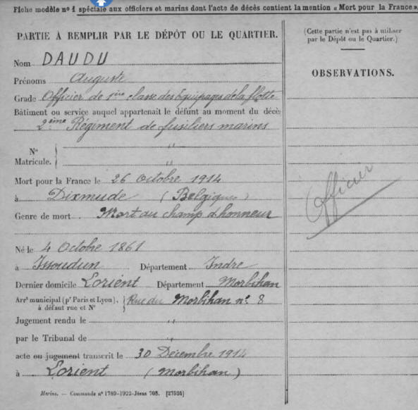 Tué le 26 octobre 1914 à DIXMUDE (Flandre occidentale), BELGIQUE.