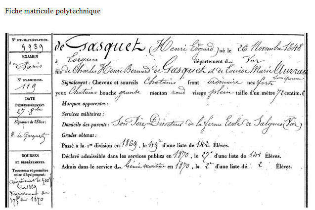 Edgard de GASQUET, école polytechnique 1873, artillerie de