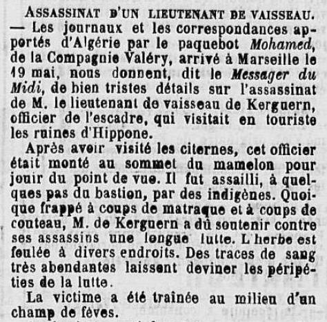 visite en touriste des ruines d'Hippone, il y fut attaqué le 10 mai