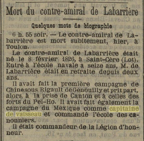 SAINT-CÉRÉ (Lot) - Décédé le 18 février 1890 à TOULON (Var)