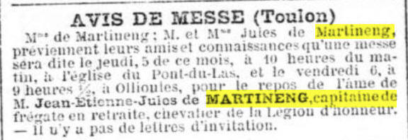 TOULON (Var) - Décédé le 28 décembre 1887 à OLLIOULES (Var)