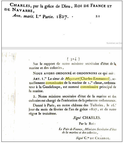 Commissaire principal En poste à la Guadeloupe le 16 février 1827