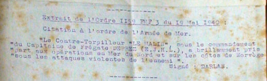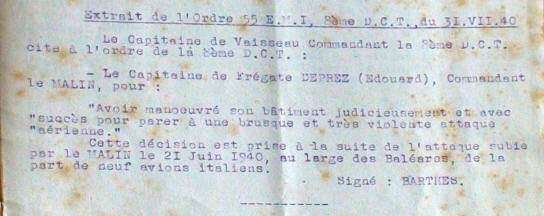 Commandant le contre-torpilleur "MALIN" le 5 novembre 1939.