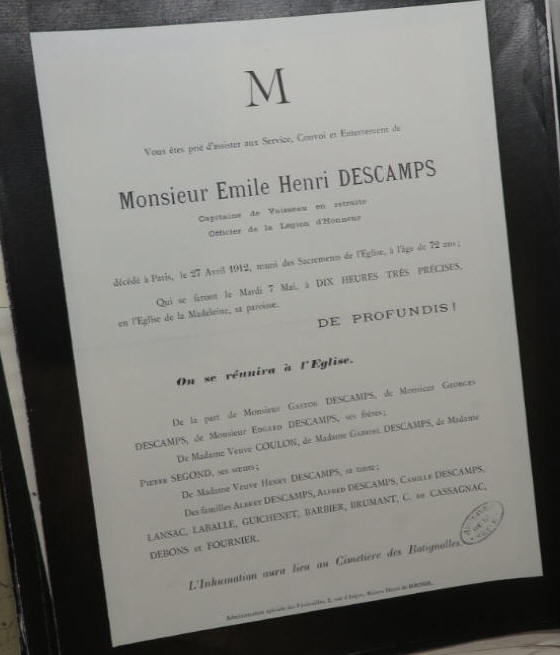 GUADELOUPE - Décédé le 27 avril 1912 à PARIS VIIIème (Seine).