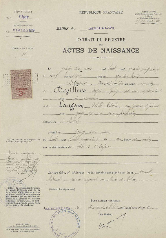 MEHUN-sur-YÈVRE (Cher) - Décédé le 21 aout 1960 à PARIS XIXe