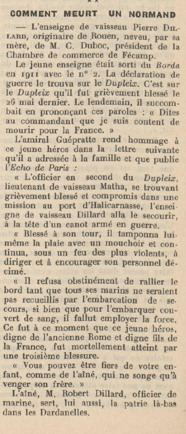 sur le croiseur cuirassé "DUPLEIX", il est tué à l'ennemi.