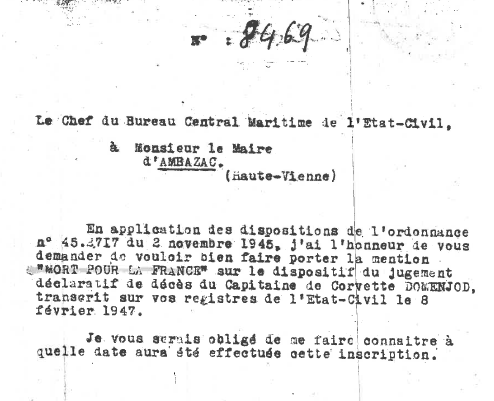 Décédé le 18 septembre 1944 à AMBAZAC (Haute-Vienne).
