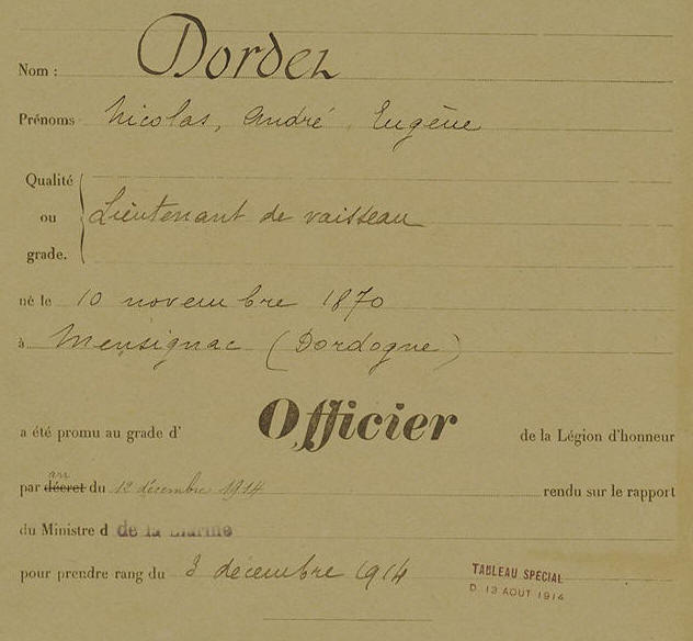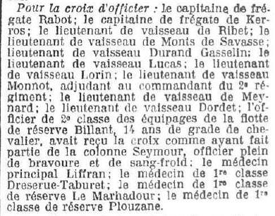 il est cité à l'ordre de l'Armée navale : " A commandé un bataillon